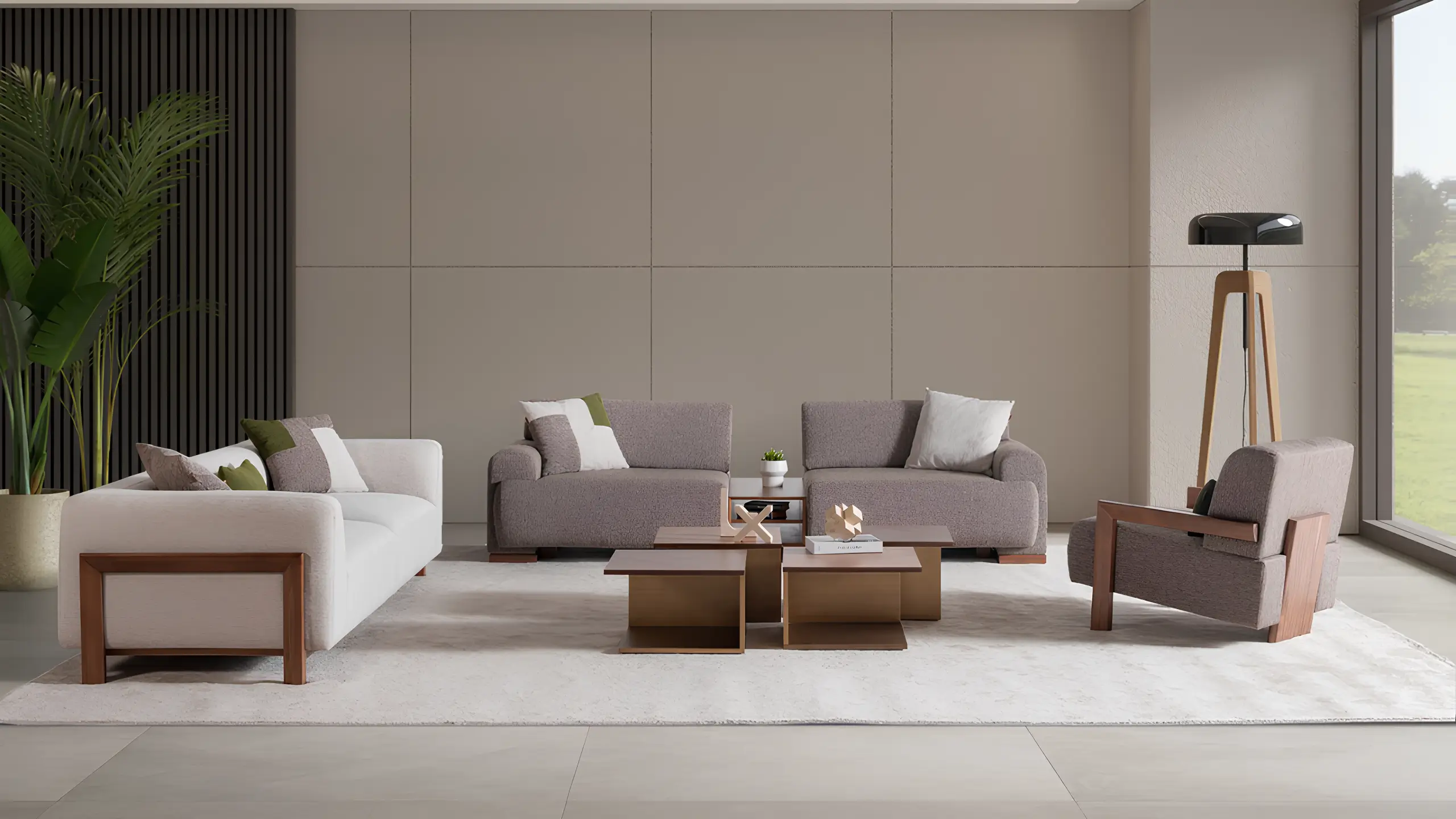 The Sofa Set features a sleek and modern design that effortlessly complements a variety of interior decor styles. Its clean lines, minimalist aesthetic, and elegant contours make it a stylish addition to any living room. The set includes a spacious three-seater sofa, a chic loveseat, and a cozy armchair, all designed to create a cohesive and inviting atmosphere. The upholstery, available in neutral tones, enhances the modern look while allowing flexibility in accessorizing with vibrant cushions and throws.