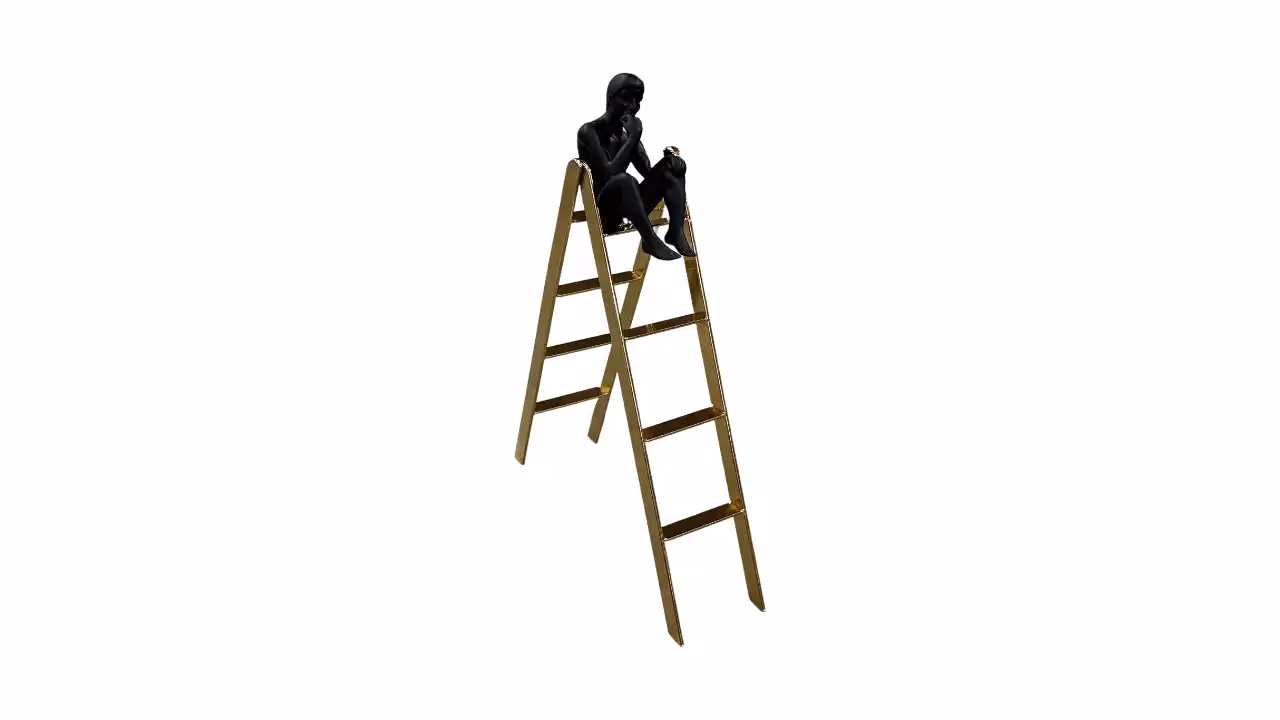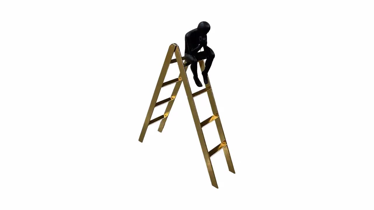 The Staircase Ornament is a striking piece of modern art that combines symbolism and contemporary design. This ornament features a matte black minimalist figure in a classic “Thinker” pose, thoughtfully perched atop a sleek, gold-finished ladder or staircase structure.